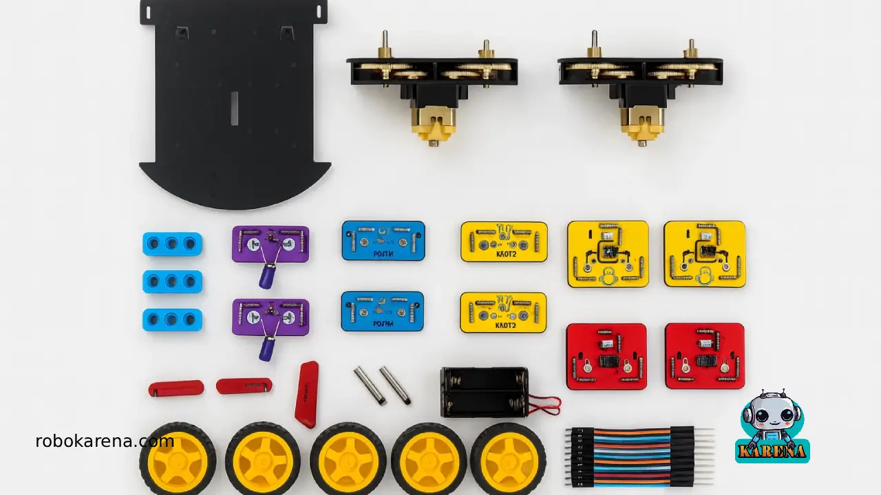 برد اصلی 2 عدد ترانزیستورقدرت، 2عدد ترانزیستورساده، 2عدد مقاومت، 2عدد سنسور مادون قرمز، 2عدد سنسور فوتورزیستور،4عدد چرخ، 2عدد موتور-گیربکس، 15سیم ، 2 عدد وارنیش و دفترچه راهنما |